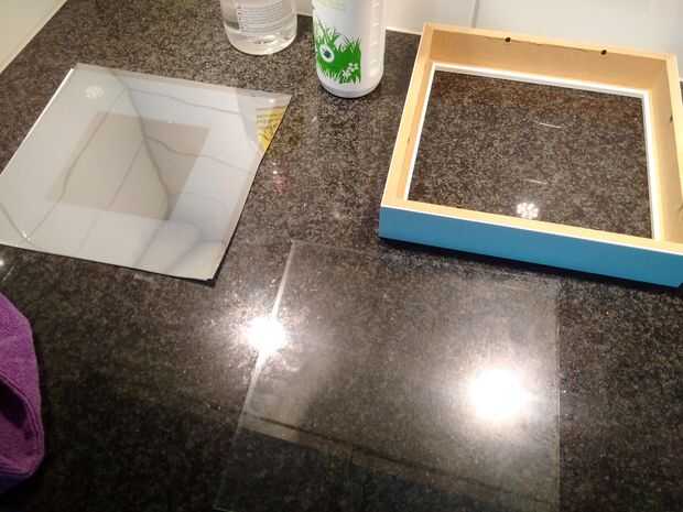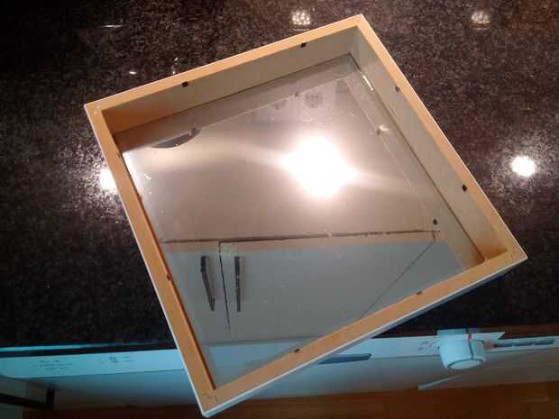 Añadir la película espejo en el interior de la armazón glas. Esto fue difícil, utilice una gota de jabón en agua y rociar en la glas antes de añadir la película. (Probablemente a rehacer esta parte más tarde, terminé con un montón de pequeñas burbujas/imperfecciones. Pero realmente no se presentan cuando la luz está encendida)
