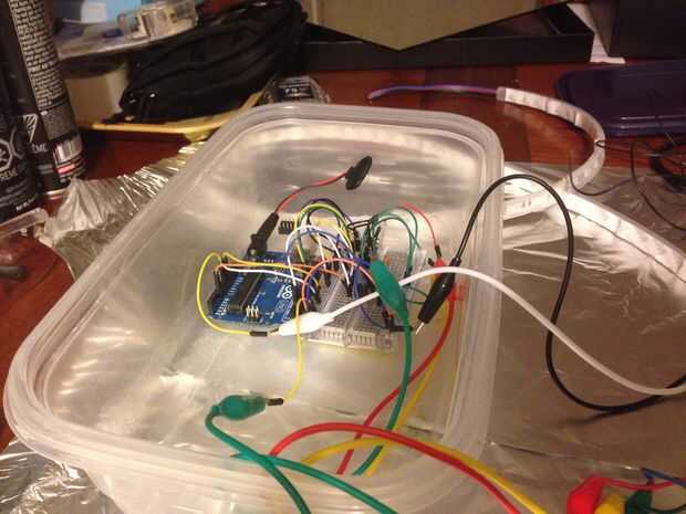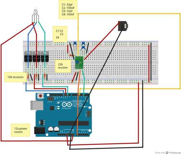 Que originalmente tenía este trabajo en el protoboard pero debido a la falta de piezas que tuve que desarmar cuando era tiempo de comenzar a soldar. Mi final circuito no funcionaría correctamente, sólo débilmente iluminando pero no pulso o el cambio de color. Después de que lo configuro en el protoboard otra vez con todas las piezas nuevas el mismo problema ocurrió. Se encontró que mi configuración del condensador fue hacia atrás pero todavía no el funcionamiento. La luz es blanco completo poder y más de una luz estroboscópica. Si juegas con el condensador 33pf, celebración de una final, el proyecto se enciende correctamente. En los foros de la Web de arduino encontré otros teniendo este problema así pero yo todavía estoy depurando.