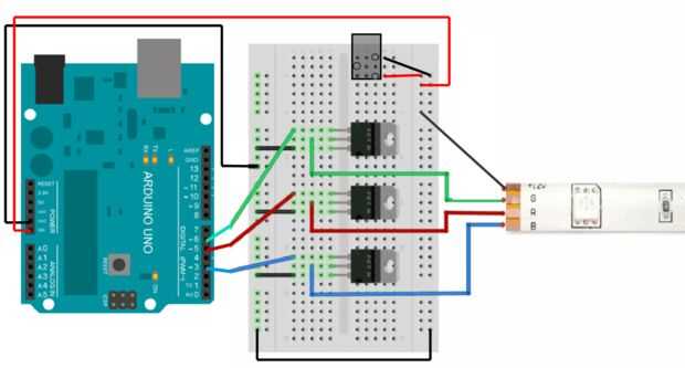 (En referencia a la imagen MOSFET, el perno superior conduce a la clavija en el Arduino, el medio conduce al cable apropiado en la tira de LED, y la espiga inferior conduce a tierra.)