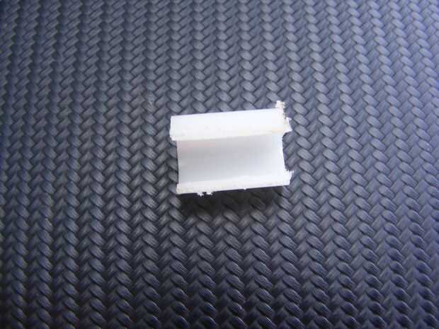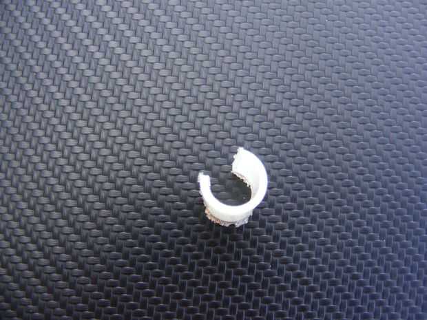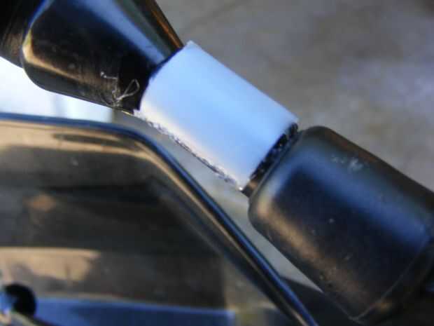 Si usted necesita agrandar el diámetro de tallo de espejo, quitar una sección de 90 grados de la manga de nylon usando una sierra para metales y asegure para tallo con pegamento del espejo como se muestra en las fotos. Usé pegamento doméstico E6000 porque es un poco menos secreción de epoxy.