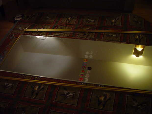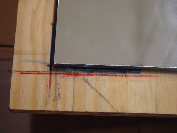 • Después de eso, invirtió las posiciones (capas en la parte superior del marco) y utiliza los agujeros guía para centrar el marco otra vez y fijarlo con tornillos. Asegúrese de que los tornillos se hunden debajo de superficie de la madera contrachapada. El espejo se pega encima de ellos.