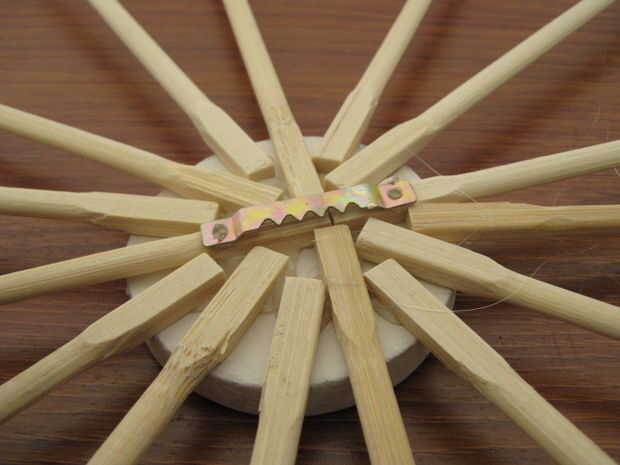 hacer un hermoso bacelet de palillos reutilizados!Paso 1: cortar el extremo de los palillos materiales-los palillos-una sierra de mano. banda de rodadura elásticamarca 2" de los extremos puntiagudos de los palillosPaso 2: haga 2 orificiosUse un talad