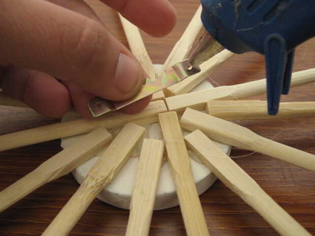materiales-los palillos-la Sierra-caliente el pegamento-bola de espuma de poliestirenoPaso 1: cortar algunos palillos cortar los palillos, las partes planasdejar el extremo puntiagudo para otra instructablePaso 2: pegar los palillos como este usar la