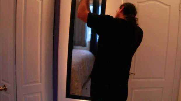 Realmente colgantes y alinear el espejo es sin duda la parte más difícil. Puede tener un tiempo más fácil si la mueves temporalmente el luces fuera del camino. Uno tiene el cable de espejo y la imagen centrado en el gancho de Hércules, asegúrese de que su espaciadores de toalla de papel tienen el espejo, y que son todo perpendiculares a la pared. A veces tienen tendencia a la curva o doblez provocando el espejo ser torcido y ni con la pared.
