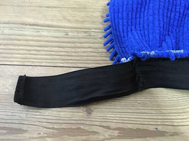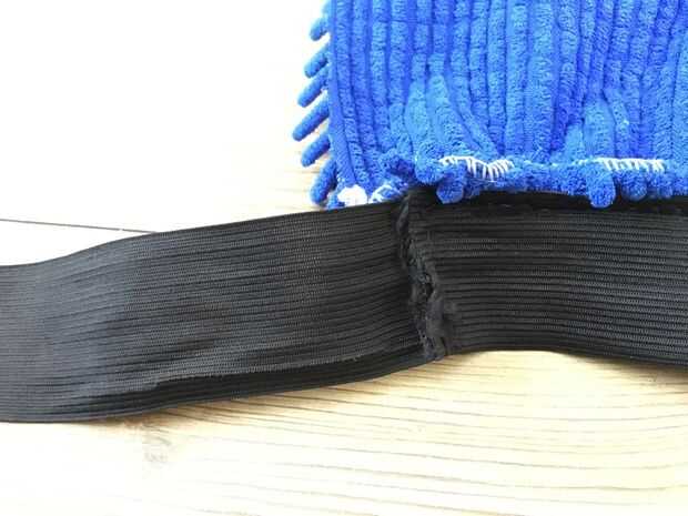 Cuando era un puño, cada pieza de elástico fue cosido a través de dos paneles. Haremos lo mismo. Estirar el elástico hasta el largo suficiente para cruzar los paneles y estirada por fijación, sujeción o pidiendo a un amigo para ayudar a mantener. Coser por el borde mientras que se estira hacia fuera.
