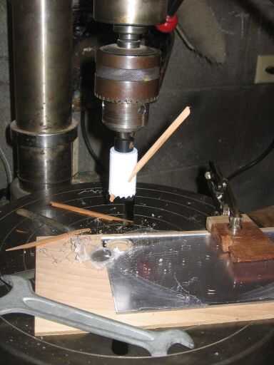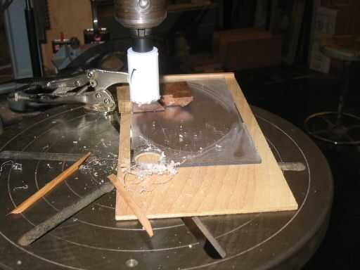 Monte la sierra y el espejo en el taladro. Disponer de una herramienta de Punch-out (yo uso un palo Romo) listo. Si la pieza de espejo tiene la película protectora, deja en! Ayudará a mantener la superficie del espejo buena durante todo el proceso.