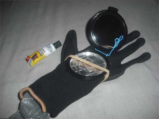 Utilicé una cinta de goma para encontrar el mejor ángulo para pegar espejo. También bolsa de plástico para cualquier pegamento empapa a través.