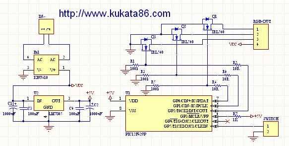 En la entrada del esquema deberá ser alimentada alrededor de 12 voltios de CA. BR1 - esquema puente hacer constante del voltaje del transformador. Este voltaje de energía de las placas LED. El mismo voltaje es estabilizado con IC. Estabilizador de U2 de 5V y procesador con IC. Transistores del MOSFET son IRF540 y gestionado por el microcontrolador. Resistencias R2, R4, R6 limite la corriente de compuerta de los transistores finales un R5 R1, R3, contribuir a la obstrucción rápida de la tensión de control de frenado de MOSFET-s. El PIC se alimenta en el paso del pin 4 en R7 y 6 pin queda pendiente porque no se usa en nuestro caso.
