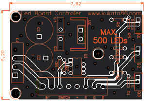 El tablero está diseñado para exterior LED driver y potencia puente. Límite de 500 leds escrito en el tablero no se aplican a la configuración en este artículo. Se describe a continuación circuito coche hasta 300 LEDs tableros de LED RGB, que está sobre la 7A a la luz de todos los colores. (en borards LED, cada LED consume 3x15mA = 45mA pero gestionado por PWM y resplandor constante sobre 22 mA forLED es cerca de 300 LEDs) Con tiras de LED debe cumplir con su consumo individual. Controlar el uso de LEDs más otros transistores de conmutación y puente rectificador o poner el segundo controlador de espejo