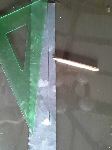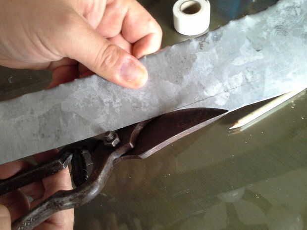 Con una regla, dibuje la raya en la hoja de metal (zinc en mi caso) y cortarlo. (2 piezas)