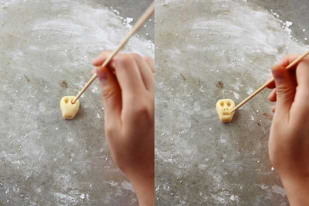 Utilizar el extremo más ancho de un pincho de madera u otra cosa con un extremo redondo para hacer "zócalos del ojo." Después de la primera inserción de la punta, probablemente tendrás moverse ligeramente con un movimiento de círculo a ensanchar la depresión hasta que parece ser del tamaño adecuado. Ahora activemos el extremo puntiagudo de la brocheta de madera o palillo de dientes para dibujar los agujeros para "nariz", así como una "boca" (me quedé con la boca cosida/encogido-buscando dibujando una línea horizontal más 3 a 4 líneas verticales cortas cruzarlo).