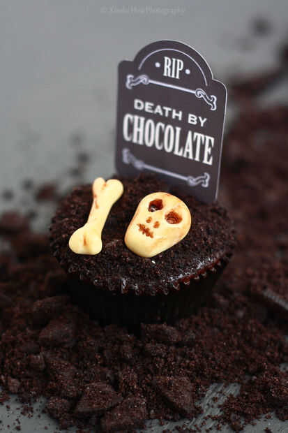 Ahora pegar un adorno de papel piedra sepulcral en cada cupcake, cerca del borde y con el texto hacia el centro de la cupcake. Por último, establecer un fondant cráneo y hueso encima de cada Magdalena cerca del centro. Disfrute de su espeluznante tratar yummy!