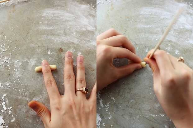 Rollo bola de fondant en un registro (aproximadamente 1 1/2 pulgadas de largo) que es más grueso en los extremos presionando en el centro mientras que utilizando el dedo índice. Utilice el extremo de un pincho de madera o un palillo para empujar en cada extremo del "hueso" para dividir en 2 secciones (como huesos reales). Luego use sus dedos para separar las secciones y lisa hacia fuera.