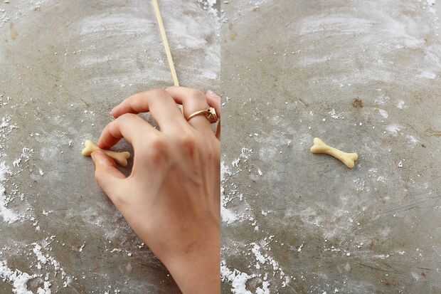 Continuar usando sus dedos pulgar e índice para alargar la parte media del hueso y hacerlo más uniforme en la anchura. Uso la punta de la brocheta de madera o palillo de dientes para dibujar algunas grietas y está ahora hecho formar su primer hueso! Repetir el mismo proceso para hacer 11 más (uno para cada cupcake).