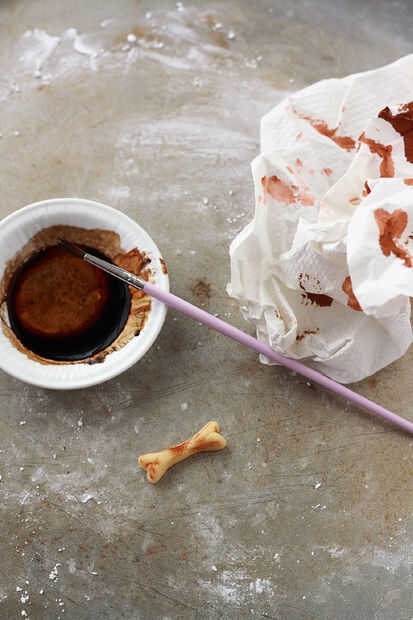 Una vez que haya terminado de formar todos los 12 huesos, volver a pintar la primera de ellas (que debe se han endurecido un poco ahora y ser más fácil de manejar). Pinté con un pincel estrecho, alimentario utilizando gel marrón diluido con vodka un poco de colorante (no utiliza agua!). Como se puede ver en la toalla de papel sucio en la foto, borrado con frecuencia (después de cada inmersión en el colorante de comida!). No olvides hacer esto o tus huesos tendrán demasiado oscuros! Unos trazos aquí y allá (sobre todo en los lados) para que se vean más envejecido y sucio. Todos los huesos de la pintura y deje secar durante al menos 8 horas y hasta 1 semana (hacer no cubren, dejarlas abiertas para el aire en un lugar seco y seguro).