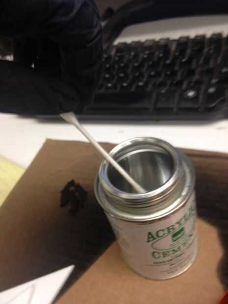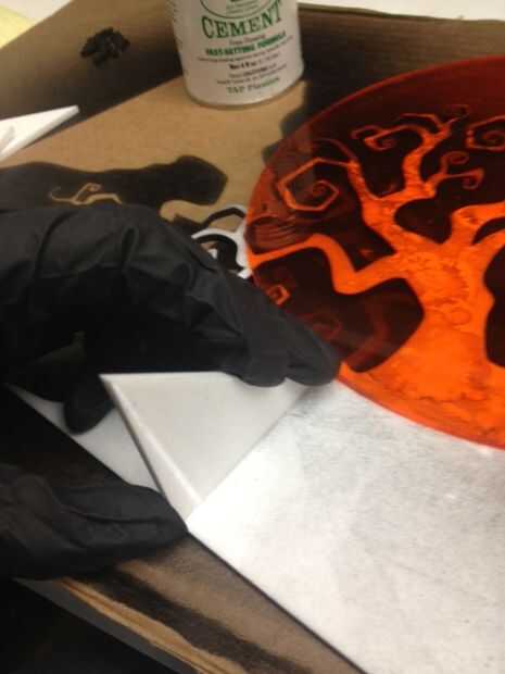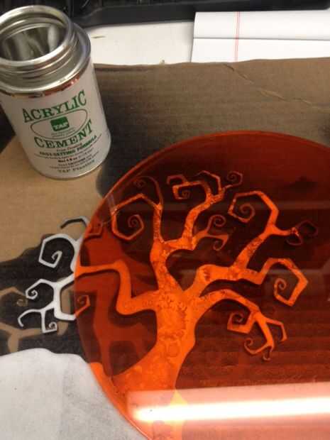 Una vez que mis artículos se cortaron hacia fuera tenía que pintar el frente de mi árbol y murciélagos negros porque pude acrílico coloreado ligero sólo fino en la tienda. Todo lo que tenía que hacer era encontrar alguna pintura en aerosol negro y pintar mi acrílico! Después de usé un q-Tip y mi cemento acrílico para unir mis artículos juntos. Primero puse mi cara de árbol hacia abajo y aplica una generosa cantidad de cemento a lo largo de los lugares mi luna se conectar a. Luego simplemente repite este paso para los murciélagos y apoya el triángulo.