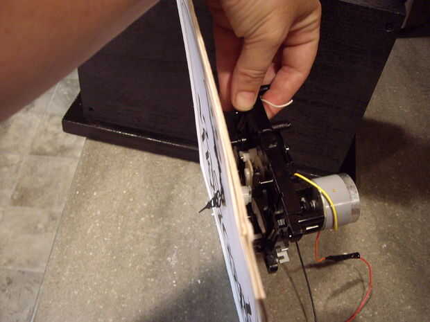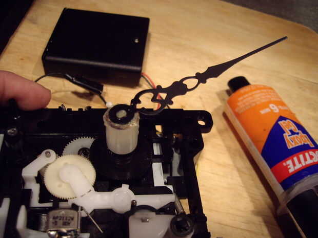 5. averiguar cuánto sobre el piñon de cassette que el minutero tiene que ser. Si no es mucho hacia fuera, él se raspan a lo largo de la cara del reloj y enredarse en la mano de la hora. Si está demasiado lejos, entonces se raspa contra el vidrio en el frente del reloj. En serio, esto era la parte más difícil del proyecto conjunto dang para mí! Para la próxima vez, tengo una mejor idea que explico en el paso final.