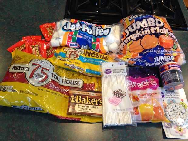 - Ingredientes--incluyendo sprinkles de Halloween, pedazos de Reese, maíz de caramelo y ojos de caramelo