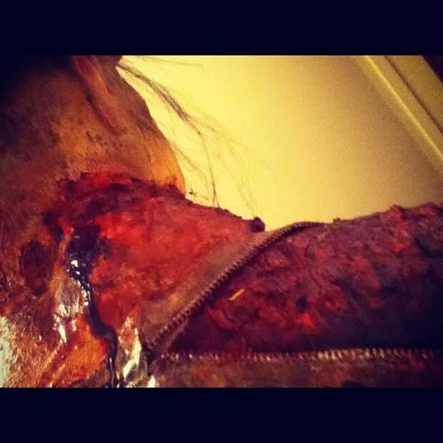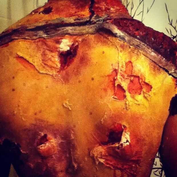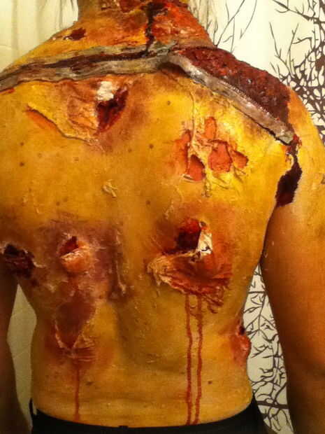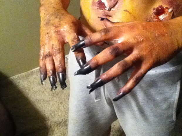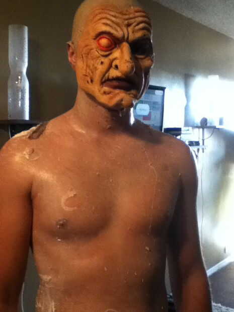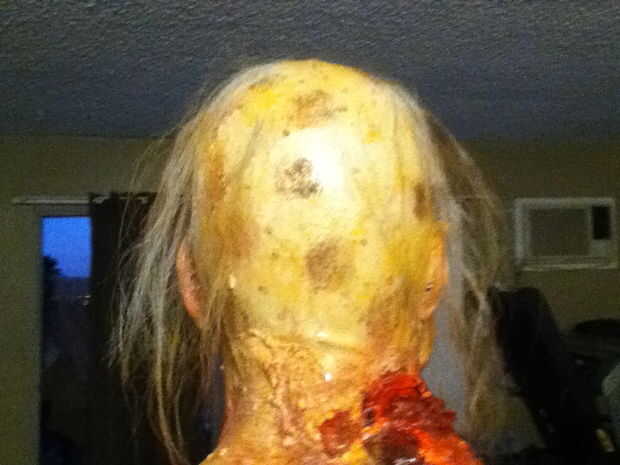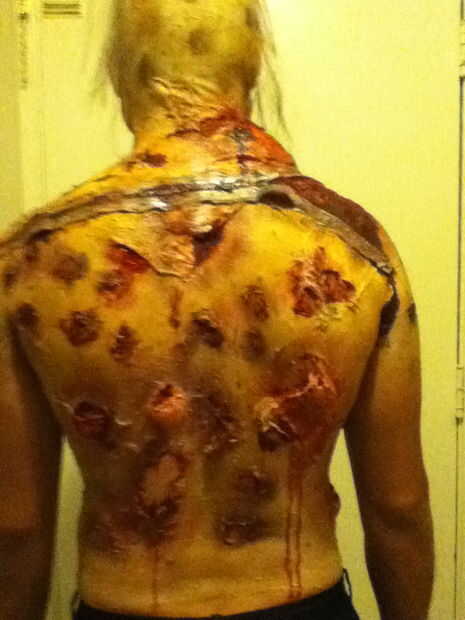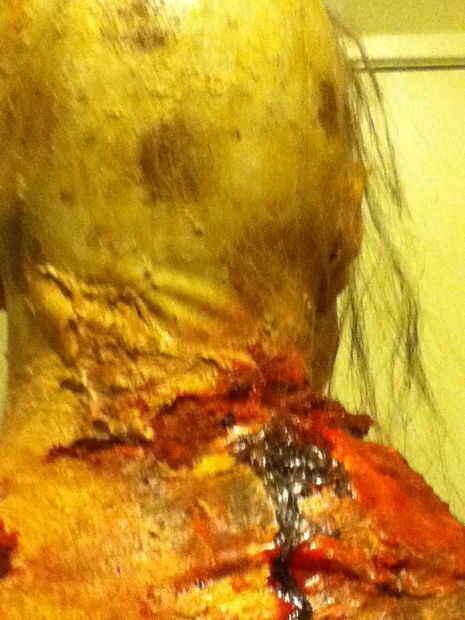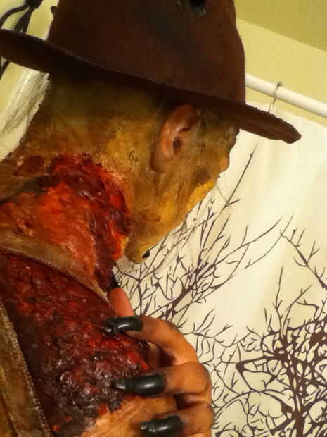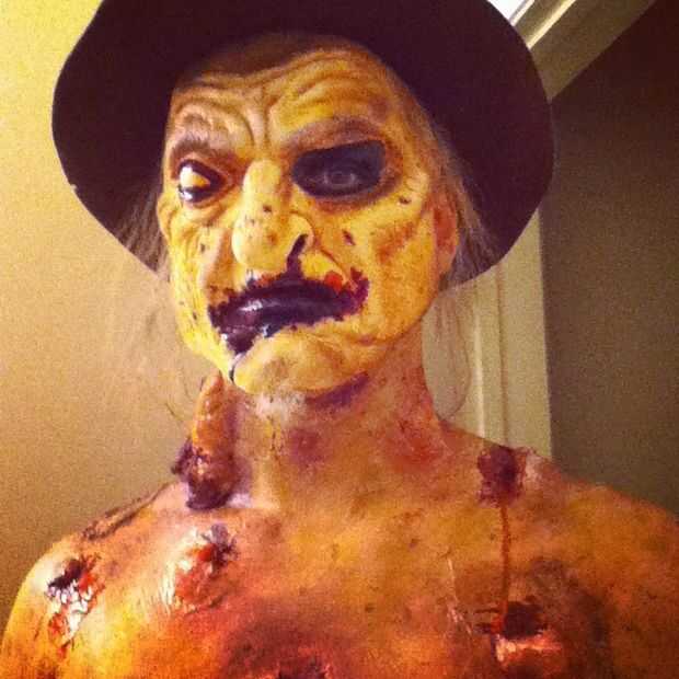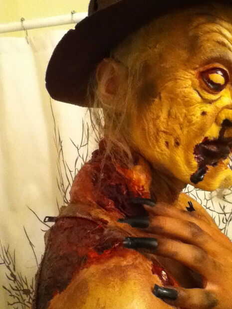 Primero comenzó con una gorra calva y usa goma de espíritu para pegar hacia abajo. Luego compré un espuma látex prótesis de Cine secretos llamados Guardián de la tumba. Después de la tapa del calva en lugar fui entonces para pegar en la espuma de la prótesis con la goma de espíritu así. Como deja la cara prótesis situado en que fui colocar una cremallera que compré en Joanns tela tienda que fue más o menos 20 pulgadas de largo. Luego lo colocó en la espalda desde un hombro al otro lado del hombro que usé carne látex de cine secretos para lograr que permanezca en la piel. Tuve mi novio ponga abajo en el piso y colocaron una bolsa de basura debajo de él porque el látex es líquido. Usé un secador para acelerar el proceso para el látex secar. Después de que la cremallera estaba en y robusto que empecé a añadir látex a su bajo vientre con mi mano. (Asegúrese de que quitan los pelos del cuerpo tienen látex después de la eliminación es muy doloroso cuando sacar) Después de que el látex se encuentra en que empecé con el maquillaje. Utiliza principalmente cine secretos maquillaje pila: criatura para hacer el maquillaje en la cara y el cuerpo. Después de terminar con el maquillaje he añadido mis últimos toques con sangre y bolas de algodón penetra los agujeros en varios lugares del cuerpo y colocar algodón bolas en los agujeros de pequeño bolsillo que hice (cuando hice los agujeros era muy cuidadoso en no tirar el látex tirando a duro o simplemente rasgarla) empapado las bolas de algodón en la sangre y los colocó en los bolsillos que hice. Alrededor de la cremallera sólo extendí las bolas de algodón que ha utilizado y utiliza gel sangre en lugar de otro para hacer el algodón en la zona de palo fueron la cremallera queda abierta. Usé pelo Crepe gris y había agregado esporádicamente alrededor de la cabeza y algunos además en el cuello. Usaba uñas de plástico negro que compré en una tienda de descuento y usado tijera para cortarlas he utilizado cinta de doble cara para que se peguen en mejor a las uñas reales. Entonces acaba de agregar un sombrero marrón para terminar la mirada.