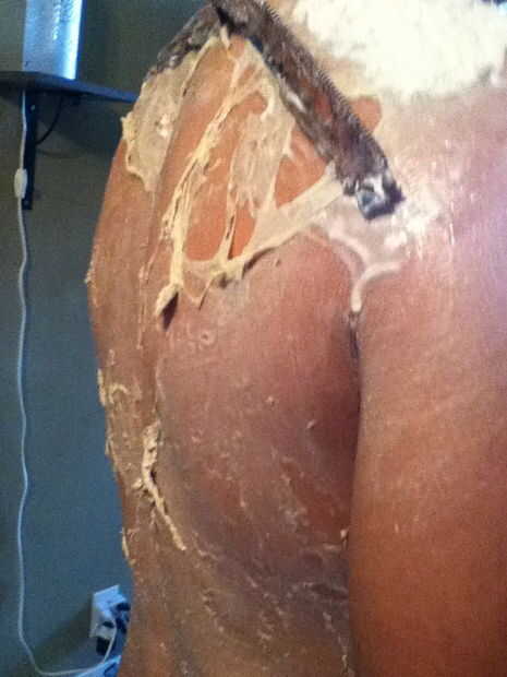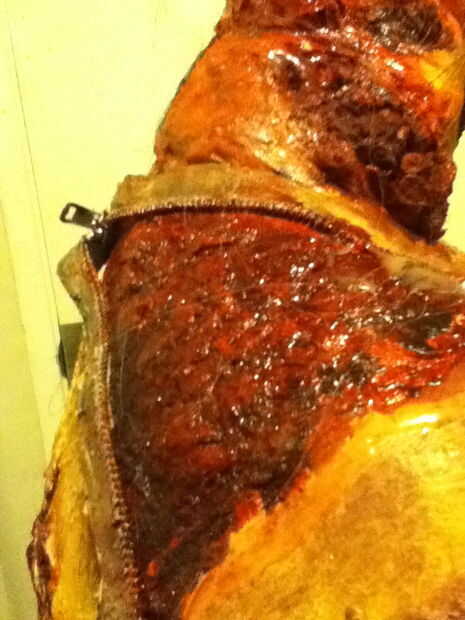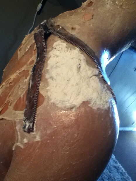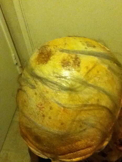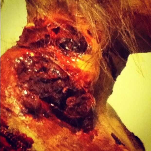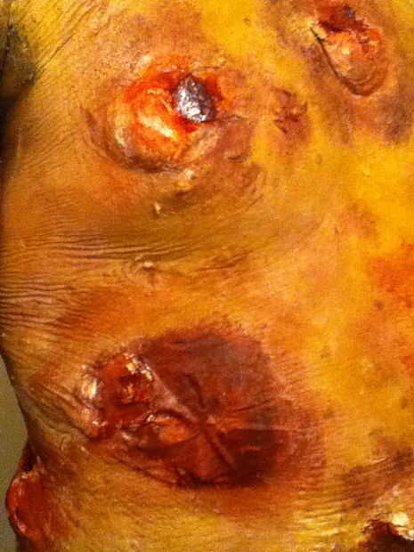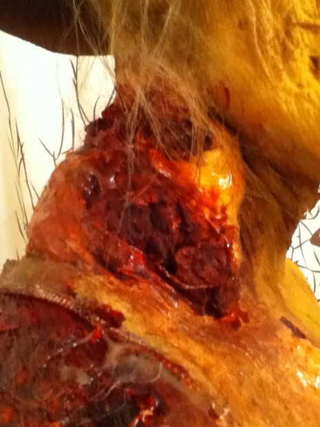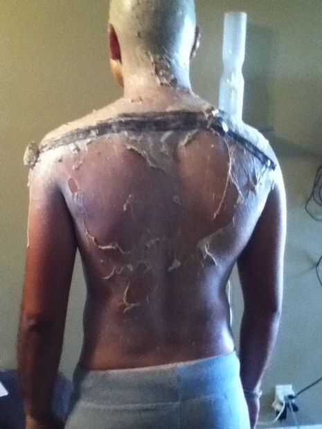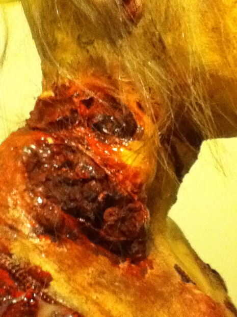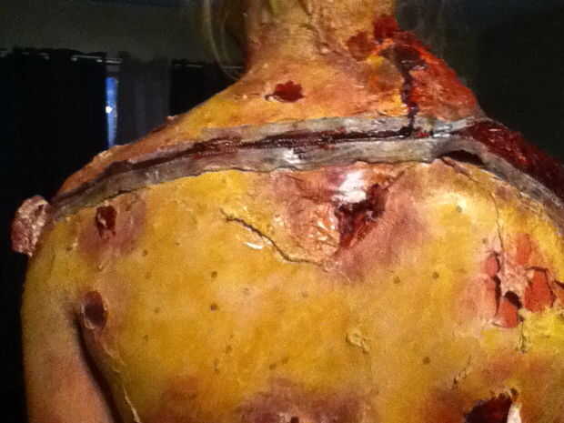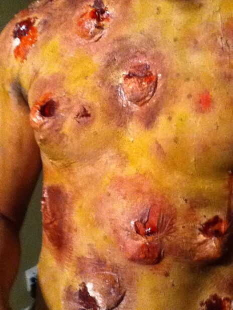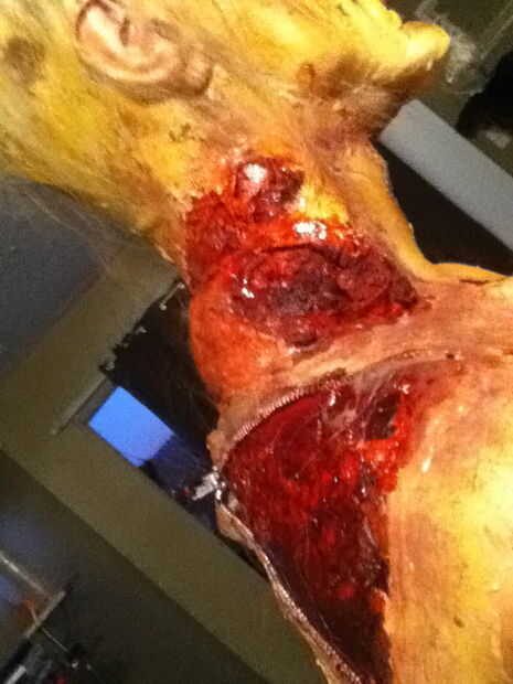 Primero comenzó con una gorra calva y usa goma de espíritu para pegar hacia abajo. Luego compré un espuma látex prótesis de Cine secretos llamados Guardián de la tumba. Después de la tapa del calva en lugar fui entonces para pegar en la espuma de la prótesis con la goma de espíritu así. Como deja la cara prótesis situado en que fui colocar una cremallera que compré en Joanns tela tienda que fue más o menos 20 pulgadas de largo. Luego lo colocó en la espalda desde un hombro al otro lado del hombro que usé carne látex de cine secretos para lograr que permanezca en la piel. Tuve mi novio ponga abajo en el piso y colocaron una bolsa de basura debajo de él porque el látex es líquido. Usé un secador para acelerar el proceso para el látex secar. Después de que la cremallera estaba en y robusto que empecé a añadir látex a su bajo vientre con mi mano. (Asegúrese de que quitan los pelos del cuerpo tienen látex después de la eliminación es muy doloroso cuando sacar) Después de que el látex se encuentra en que empecé con el maquillaje. Utiliza principalmente cine secretos maquillaje pila: criatura para hacer el maquillaje en la cara y el cuerpo. Después de terminar con el maquillaje he añadido mis últimos toques con sangre y bolas de algodón penetra los agujeros en varios lugares del cuerpo y colocar algodón bolas en los agujeros de pequeño bolsillo que hice (cuando hice los agujeros era muy cuidadoso en no tirar el látex tirando a duro o simplemente rasgarla) empapado las bolas de algodón en la sangre y los colocó en los bolsillos que hice. Alrededor de la cremallera sólo extendí las bolas de algodón que ha utilizado y utiliza gel sangre en lugar de otro para hacer el algodón en la zona de palo fueron la cremallera queda abierta. Usé pelo Crepe gris y había agregado esporádicamente alrededor de la cabeza y algunos además en el cuello. Usaba uñas de plástico negro que compré en una tienda de descuento y usado tijera para cortarlas he utilizado cinta de doble cara para que se peguen en mejor a las uñas reales. Entonces acaba de agregar un sombrero marrón para terminar la mirada.