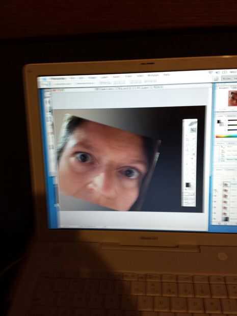 Alinearon el marco digital detrás de la pintura, para que pueda ver donde el corte ojos aparecen en la pantalla. Luego muy ligeramente pegué algunas cintas a través de los agujeros en la superficie de la pantalla por lo que puedo tener una visual en donde los ojos se suponen que aparecen.