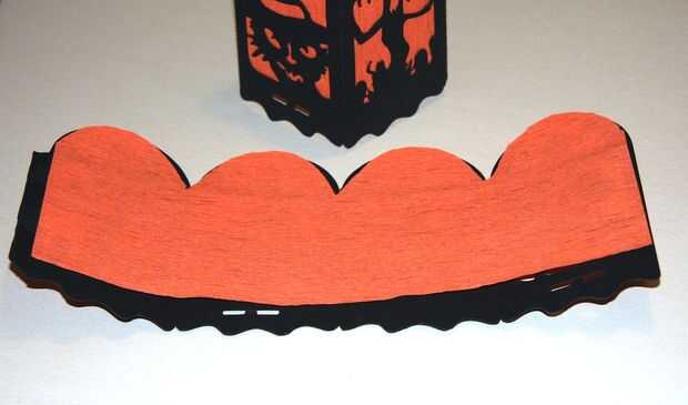Colocar la parte exterior de la linterna hacia abajo, para que el interior es cara hacia arriba. Aplicar pegamento ligeramente a áreas más grandes del interior del armazón negro, luego colocar la crepe sobre el pegamento aplicado y deje para secar con peso esta sujeta en su lugar.