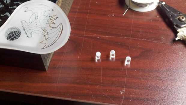 Tomar la clara acción y corte (3) 1/4" piezas y los bordes de arena plana asegurándose de son todos la misma altura y pegarlos de forma triangular a la lágrima de acrílico. Pegue el fieltros puntos a los fondos de los pies stock ronda.