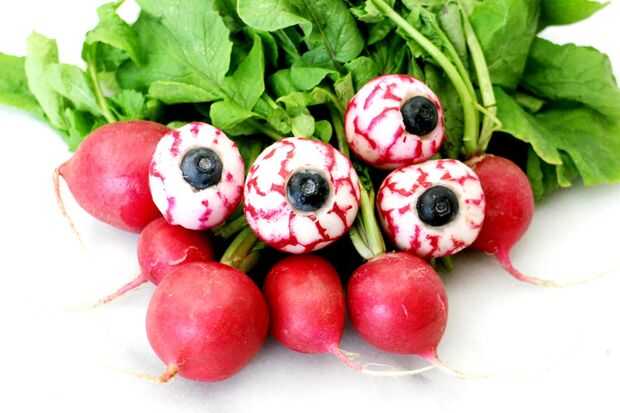 Spookify cualquier ensalada, plato de verduras, calabaza tallada o cóctel Halloween con estos ojos de rábano comestible. Super fáciles de hacer, son una manera fácil de asustar a los invitados y seres queridos.