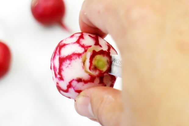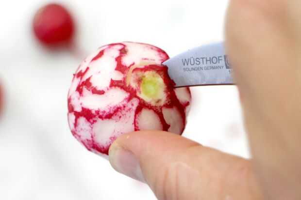 Usando el cuchillo de emparejamiento, tallar hacia fuera una cavidad 'iris' de arándanos tamaño en cada ojo de rábano donde estaban conectados los verdes.