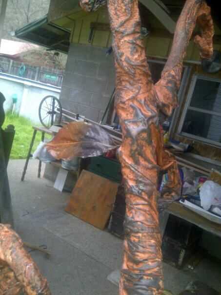 Para Halloween este año, hice a mi hija un disfraz de árbol. El traje es de forro polar marrón, las ramas son alambre cubierto con lana marrón, y todos los adornos se sienten. Se mantiene unida principalmente con pegamento caliente, aunque la camiset