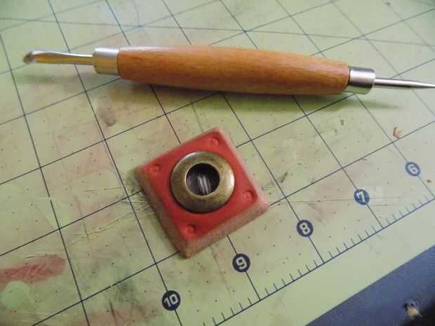Agregue detalles con una herramienta de modelado de cuero. Acaba de dibujar unos círculos en las esquinas, pero solobo ha creado un ible en herramientas de cuero que serían muy útil si desea añadir más.