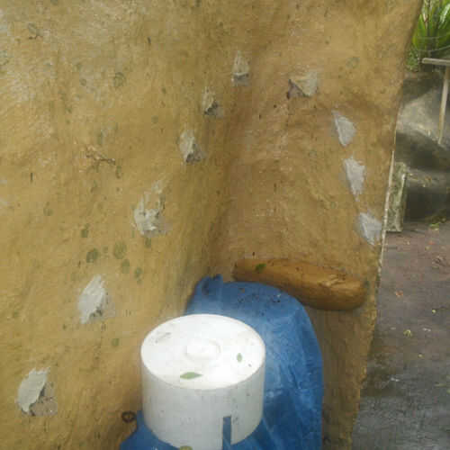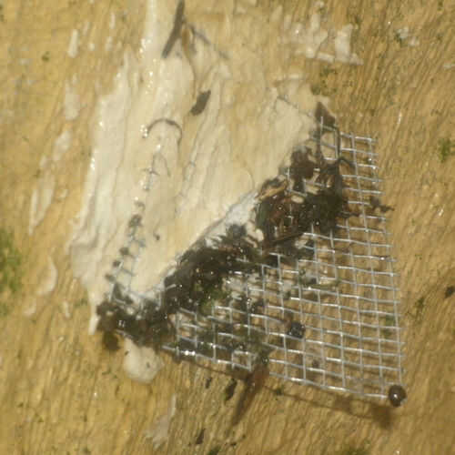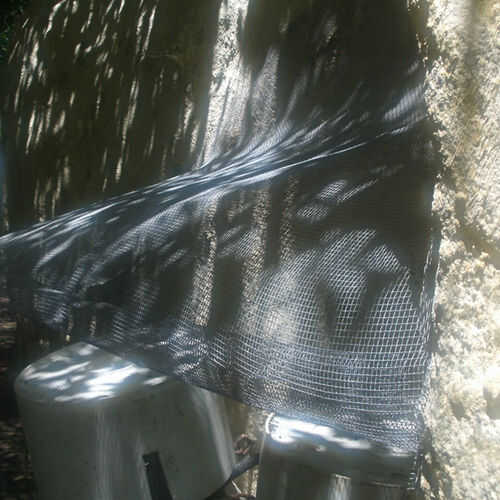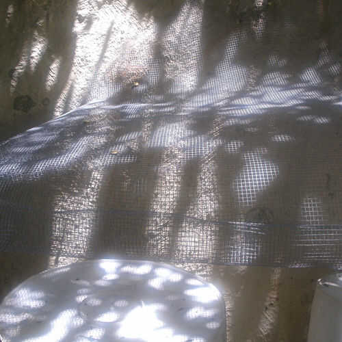 Se trata de construcción simple Add-on. Primero cortar algunos hilos cuadrados de malla, había doblado por la mitad y había pegado a la mitad de la plaza a la pared con un mortero de capa delgada. Cuando eso fue duro, he usado sujetadores de papel pequeñas (con la cabeza y dos piernas que empuja a través y agacharse) para fijar la forma de la malla a los puntos de fijación de pared. Si usted tiene un problema con las patas de sujeción tirando hacia fuera, alicates de punta y doblar las puntas a través de la malla y doblar otra vez. Así, ellos no tiran hacia fuera.