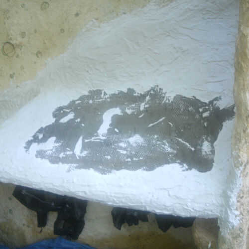 Extiende una lona para mantener el piso limpio. Utiliza un gran cuchillo de paleta de enyesado con, pero puede utilizar otras herramientas como paleta. Uso guantes de goma para proteger las manos y se pueden limpiar el material con la mano a veces para ahorrar tiempo.