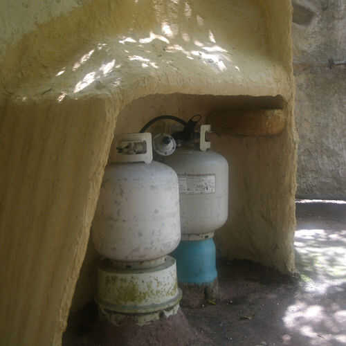 Puse un trozo de tubo, como una barra de cortina por encima de los tanques (no se puede ver en las fotos) para luego colgar una cortina de esconder los tanques. Los orificios perforados en las paredes en ambos extremos permiten pernos de acero inoxidable entrar en el tubo de cualquiera de los extremos y sostener en su lugar. Los pernos se pueden sacar para quitar el tubo. Si tienes yeso alrededor de los pernos (lo hice en un extremo), cubrir el pin con vaselina para que el mortero no se pegue a él.