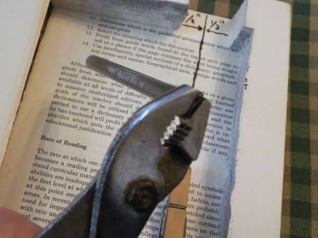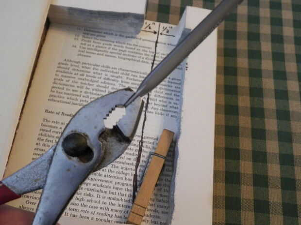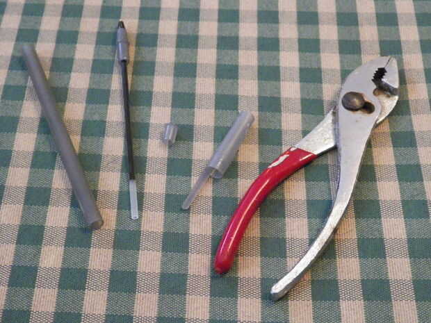 Alicate para desmontar una pluma de la oficina normal, guardar el cuerpo y la tapa, pero descartando el cartucho de tinta y la tapa piramidal/en forma de cono. A continuación, tomar el cuerpo principal de la pluma y aplastar un extremo plano, como se muestra en las fotos.