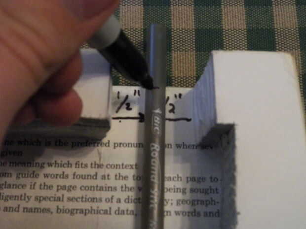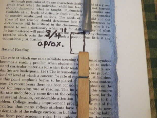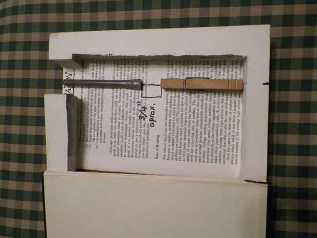 Coloque la pinza en la línea trazada anteriormente, contra la pared del fondo del libro y encolarla con una saludable cantidad de pegamento caliente. Alinee el lado plano de la pluma con la pinza y coloque aproximadamente 3/4" aparte, como se muestra. Marcar y eliminar cualquier exceso de plástico (con cortador de alambre o algún otro objeto punzante), para que el cuerpo de la pluma no cuelgue fuera del libro. Colocar la tapa circular de la pluma y el lápiz en lugar del pegamento. Recuerde utilizar el pegamento caliente liberalmente!