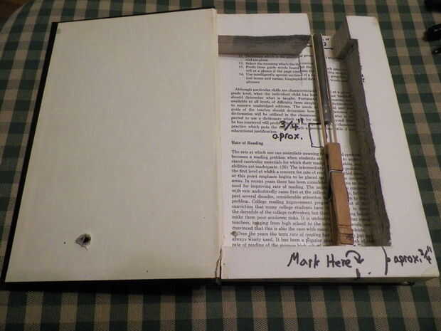 Mejor manera posible, marcar un punto en el exterior del libro que está directamente sobre el control extremo de la pinza para la ropa. Con una navaja o cuchillo x-acto, corte un agujero a través de ese punto, para que, a través del libro, pulse la pinza abierta con cualquier objeto bastante flaco (pluma, palillo de dientes, etc.). Carga de la CSRBL del mismo modo se carga una pistola de goma ordinaria. Para disparar, simplemente el lanzador de goma espía encubierta a algunos desprevenido blanco, pulse la pinza para la ropa con una pluma, palillo de dientes, etc. y caer rápidamente al final del libro para ocultar el hecho de que hay un agujero de 1 "X 1" al final.