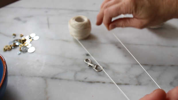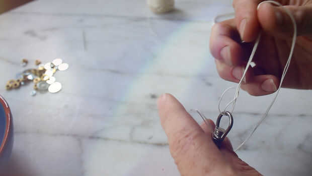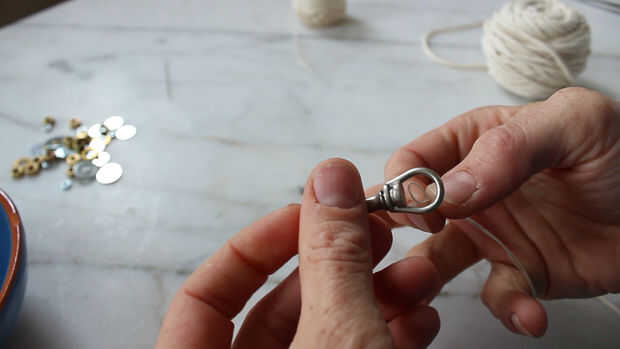 Cortar un 1-1.5 pies de cuerda, doblar por la mitad y lazo en la parte inferior del cierre. Sacar de las terminaciones del hilo a través del lazo y ajuste en la hebilla.
