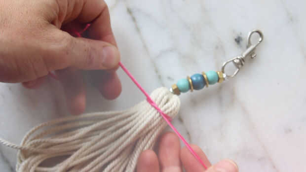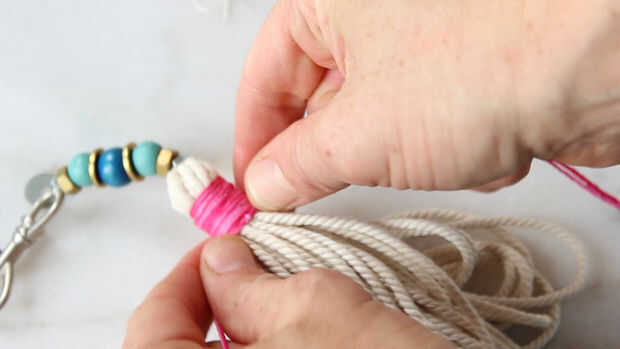 Atar el extremo de su hilo de bordar alrededor de la cuerda, cerca de los abalorios. Asegúrese de dejar suficiente hilo para amarrar otra vez al final. Ahora enrolle el hilo fuertemente alrededor y alrededor de la cuerda. Cuando haya hecho el hilo de bordar tan amplio como usted quiere, ate.