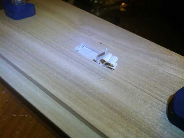 Dicho esto, este es donde me cagué! No tengo un taladro escoplear así que corte la mortaja con un martillo y cincel. Donde me cagué es; Trató de centrado y la mortaja de ambos lados de la marca y corte la mitad cada lado, superior e inferior. Lo has adivinado, no se alinean perfectamente! Así que tuve un pequeño rasgón hacia fuera el bajo lateral mientras que intenta conseguir la perilla de ajuste. Ahora que he terminado me doy cuenta tengo debo solo centrado y marcado la parte superior, fijar la madera a un soporte sacrificatorio y cincelado estrecho a través de la parte superior.