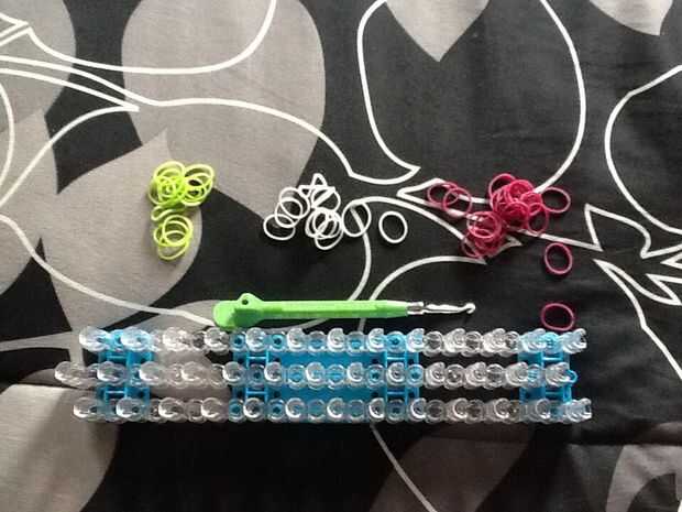 Paso 1: materiales: Necesita...Un kit de telar del arco irisBandas de gomaGancho telar de arco irisClip C o S clip :)Paso 2: Hacer la pulsera: Tomar una banda elástica y tuérzalo alrededor de dos clavijas que telar.Paso 3: Una vez que tengas la goma