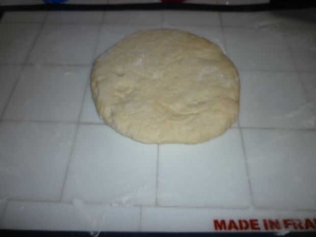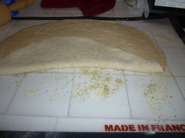 Espolvorear la superficie de rodadura con harina y una vez que se han rodado a un tamaño decente, Espolvoree la mezcla de café de harina de maíz en la parte inferior de la masa. Esto que la masa no se pegue y agregar algún sabor.