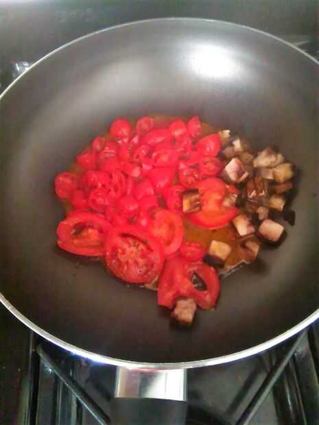 1. Agregue los tomates y champiñones en una sartén aceite de oliva y dejar que la salsa reduzca