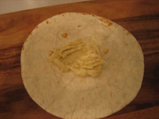 2. Unte una pequeña cantidad (unas dos cucharaditas) de la mezcla en el centro de cada tortilla