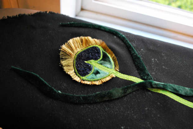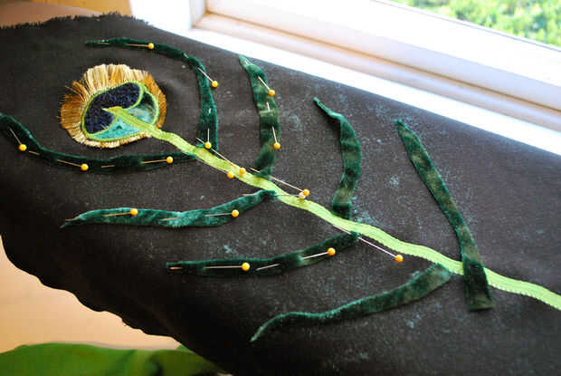 Como colocar cada hilo de terciopelo, me recorte la parte sobrante y pin en su lugar. Estoy usando el terciopelo para crear la estructura de la pluma. Estos filamentos guiará el resto de mi costura. Se ve muy bien cuando corta el borde exterior de cada pieza de terciopelo en un punto. Esto hará que un buen borde de pluma. Se cortan los bordes más cercanos a la columna vertebral para que tope contra la columna vertebral.