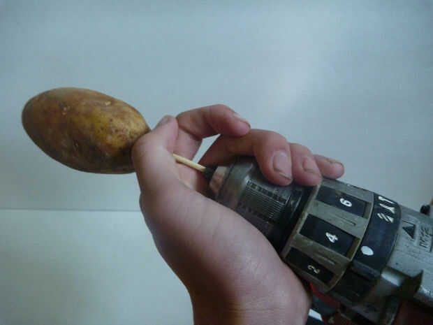 Meter el pincho en la patata y poner el pincho en el taladro como si fuera una broca.