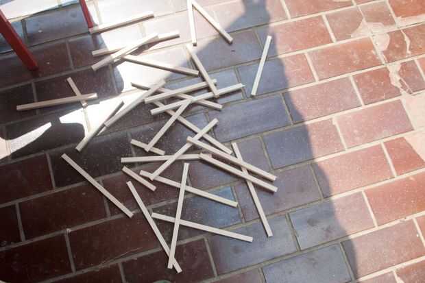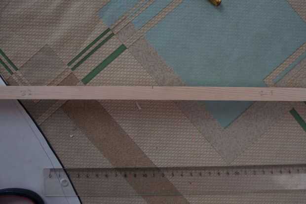 Ahora usted necesita medir la mitad de su "patrón" y ver cuánto es. Por supuesto, usted puede hacer la medición antes y salir sin un patrón que sea, pero me pareció esier así. Ahora, asegúrese de poner el número de longitud medido sobre cada pedazo de madera, de lo contrario usted tendrá un tiempo difícil averiguar que pieza va después que pedazo. Utilicé un metro 3, listón de 13x13mm, pero usted puede usar lo que quieras, lo único importante es que la espiral terminada no es muy pesada, de lo contrario el viento no mueve.