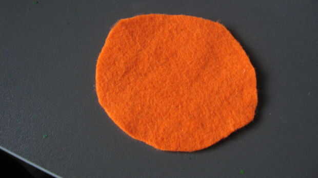 En primer lugar, cortar un círculo de tela resistente. Utilicé restos Halloween fieltro, pero también se podría utilizar esa cosa verde apoyo foral. Realmente podría cortar cualquier forma... Supongo... pero ten en cuenta que está usando una pistola de pegamento caliente afiladas esquinas no pudieran salir mejor.