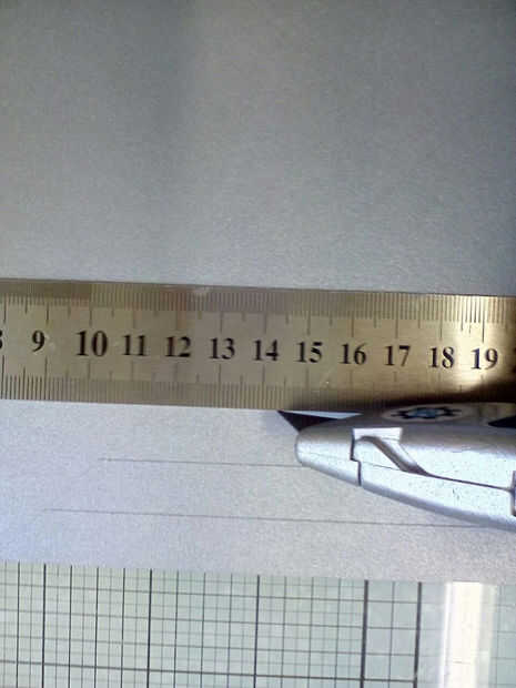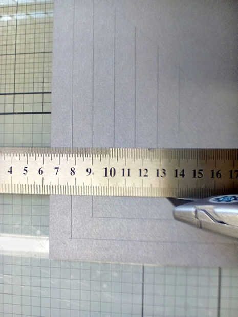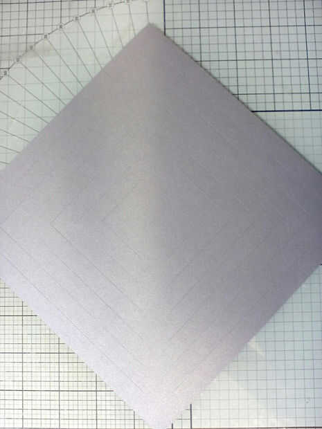 El siguiente paso es cortar las líneas - esto es más difícil de explicar con palabras que a cortado! Cortar entre las líneas diagonales, paralelas al borde de la hoja, 1/2 desde el borde entonces cada 1/2 pulgada de seis líneas. Esto creará plazas, cada media pulgada, que se cortan en todas partes pero a través de la banda diagonal.