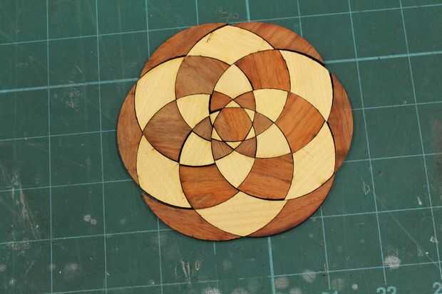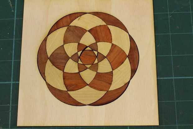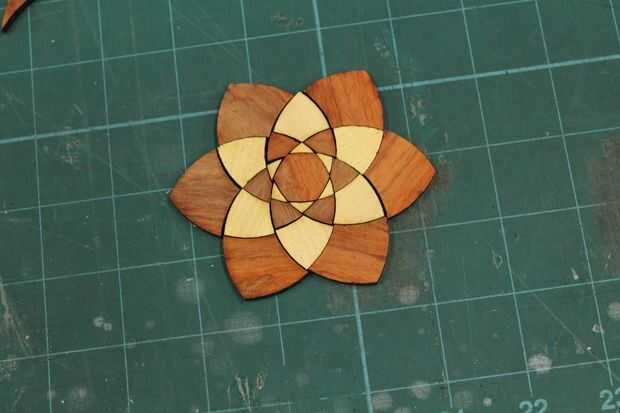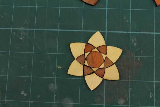 Ahora llegamos a divertirse! He utilizado Bubinga para piezas oscuras y otra madera (posiblemente Yellowheart - tengo miedo se me olvida) de madera clara. Entonces usé abedul para el marco externo. Aquí, me di cuenta de que el medio era bastante flojo. Qué tengo que hacer es que o bien ampliar el hexágono del centro o las piezas de pequeño triángulo que lo rodean.